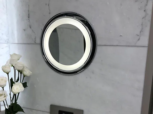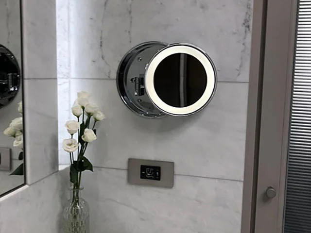 Pulsar-R is an illuminated cosmetic mirror with a diameter of 200mm and a magnification level of 3X, available in a variety of combinations. This mirror features a unique characteristic: it can be recessed directly into the wall. This innovative solution allows the mirror to be easily hidden in the wall when not in use or positioned as desired, ensuring maximum versatility and a clean and tidy appearance.